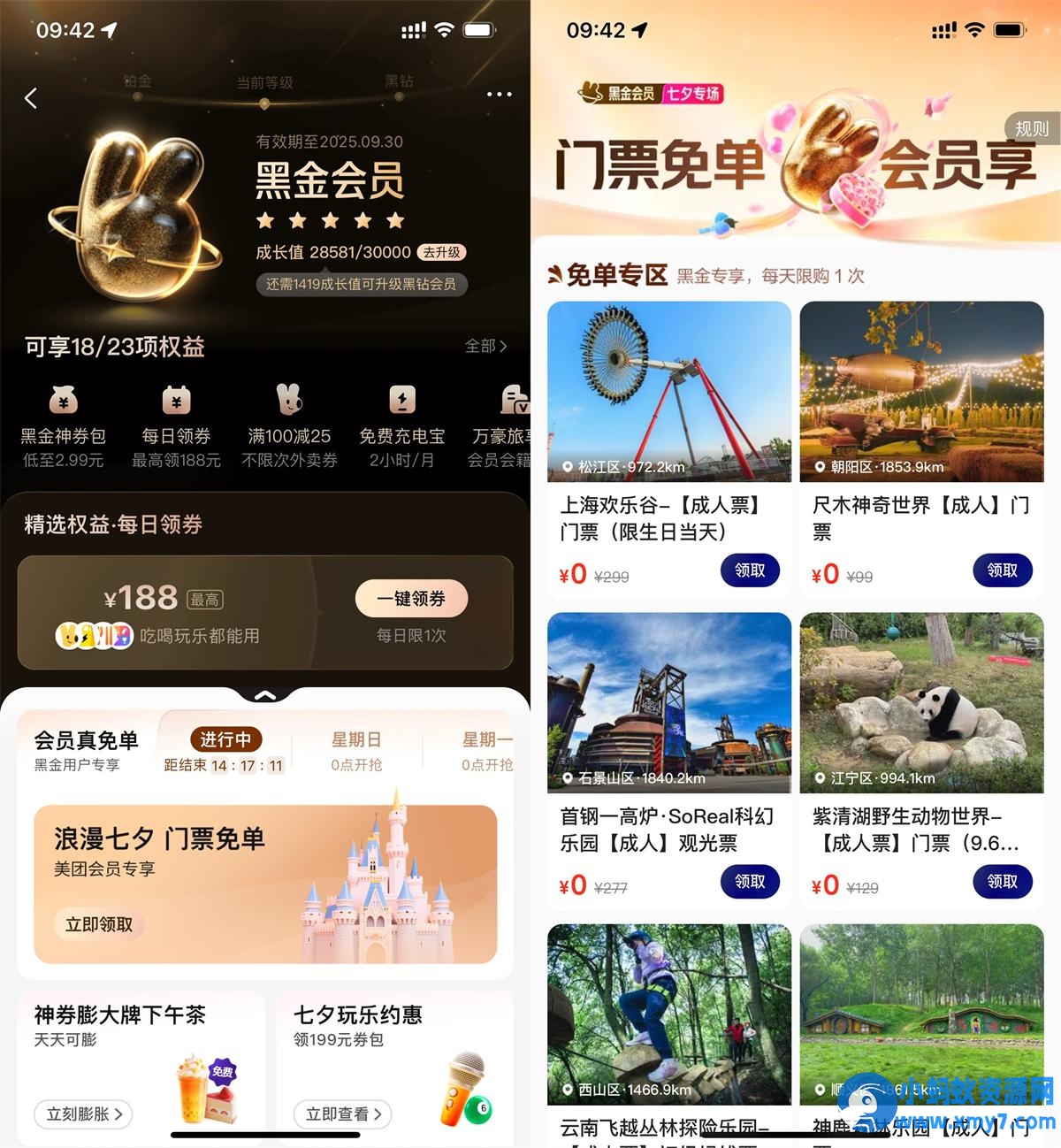 - 美团黑金黑钻会员领门票免单 2025-10-11