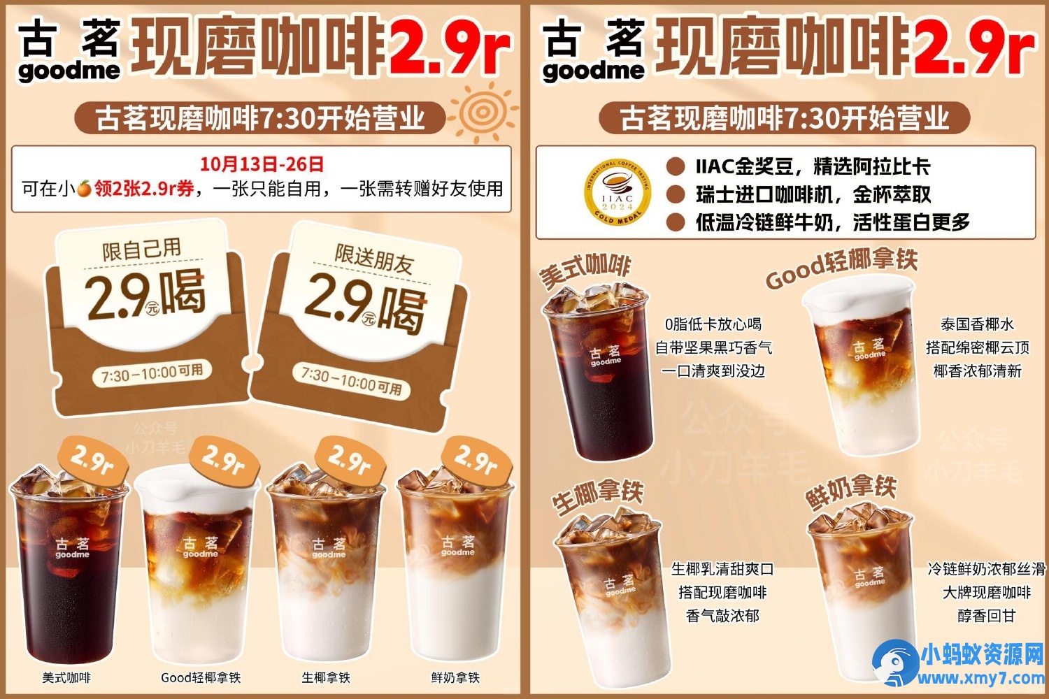 10月13日~26日可在#小程序:古茗茶饮点单 领2张2.9亓咖啡券,一张可自用 一张仅送人,古茗咖啡每天7:30开始营业