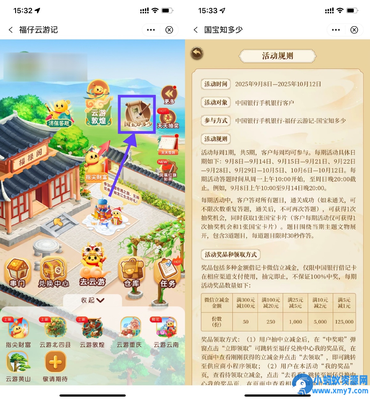中行APP搜索“福仔云游记”->国宝知多少->全部答对抽1~100亓立减